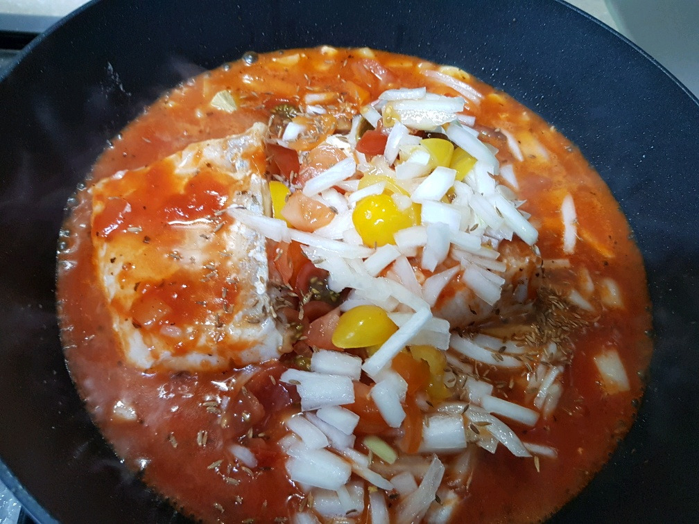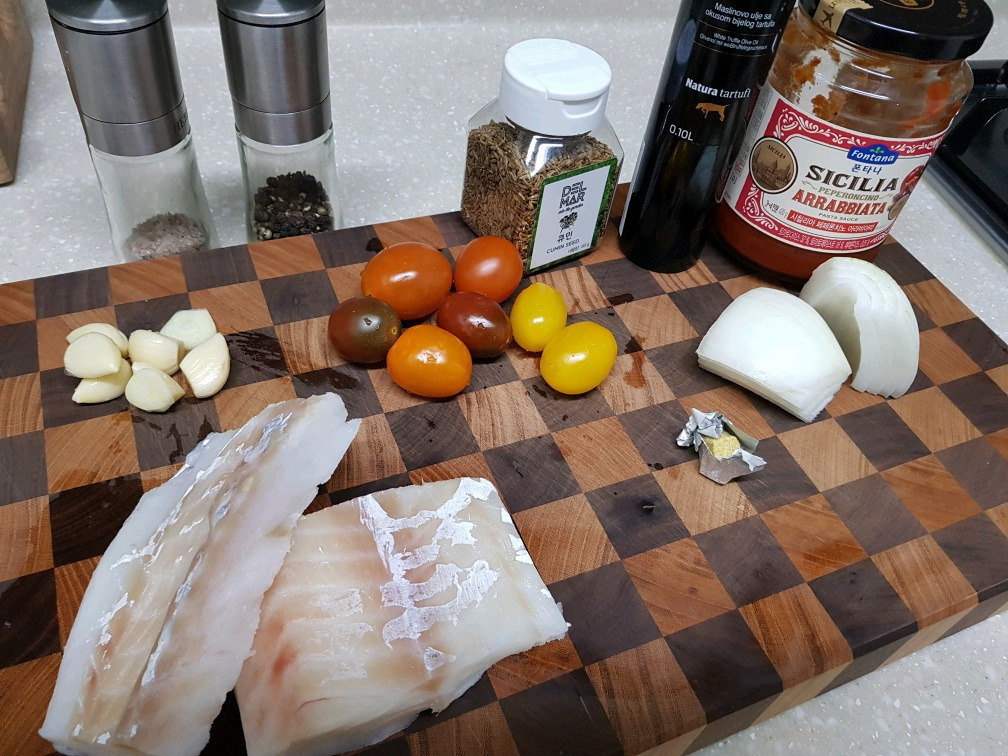 기본 재료 - 대구, 토마토, 양파, 대구, 마늘, 큐민, 토마토소스, 올리브 오일 등등