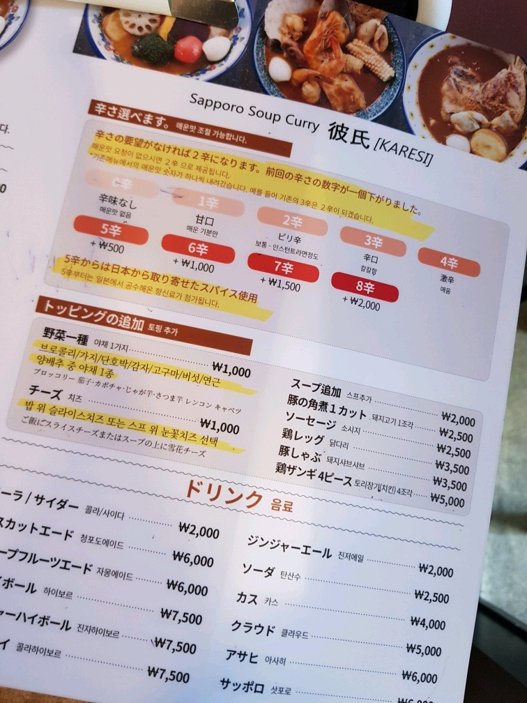 카레시 간판 그리고 메뉴판 (매운 정도를 고를 수 있다.)