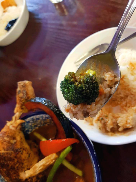 작은 차이를 넘어 짜릿한 압도적 차이를 만드는 것은 바로 구운 야채에 있다. 특히, 구운 브로콜리의 풍미는 신세계에 가깝다. 어떻게 구워야 그런 맛이 나는지 비법이 궁금하다. 먹고 난 직후, 주방에서 다음 테이블에 나갈 카레를 조리하는 주인장께 큰소리로 묻고 싶을 정도. '토치로 그냥 구워도 되나요?', '어떻게 이런 풍미를 만들어 내죠?', '사전에 밑간을 하거나 전 처리가 있나요?'