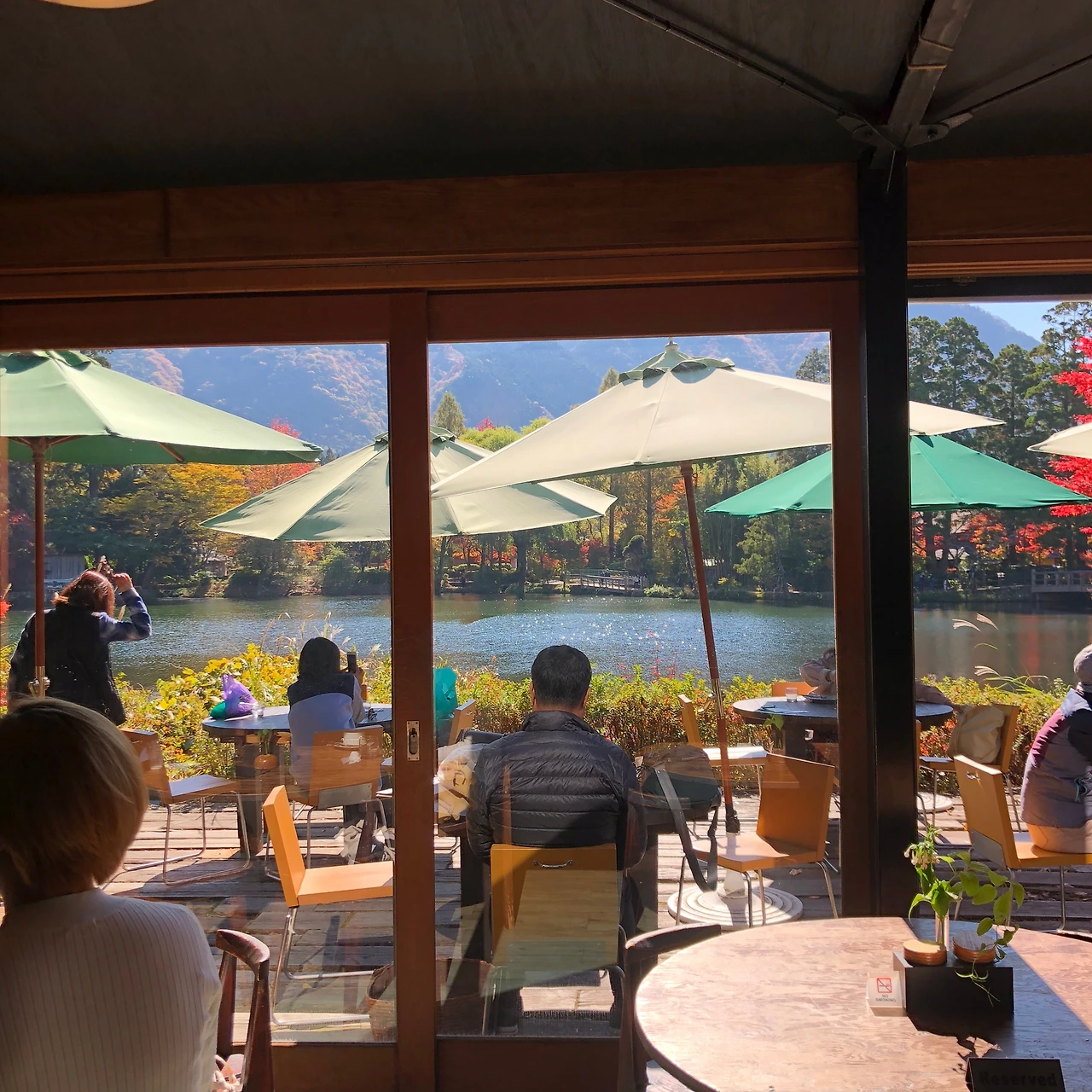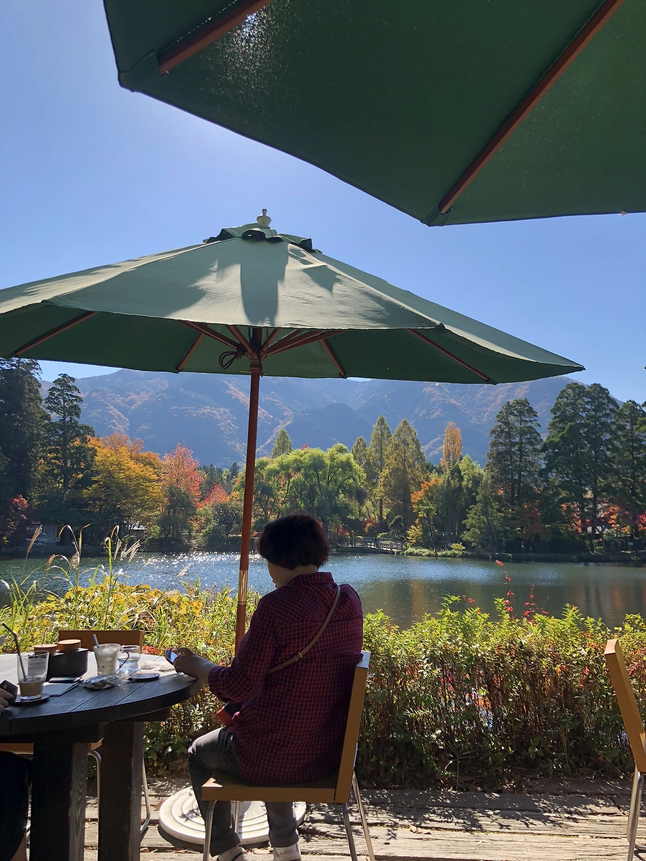 아마 사갈 미술관에 붙어있는 카페였나? 여튼 그 카페에서 음료와 디저트를 먹으며 이렇게 예쁜 가을 날의 긴린코 호수를 볼 수 있었다. 왼쪽 사진 정면에 출연한 뒷 모습은 우리 아빠. 커피랑 케이크를 먹었다. 빵 케이크 딱 질색인데 커피가 너무 써서 어쩔수 없이(?) 먹었다.