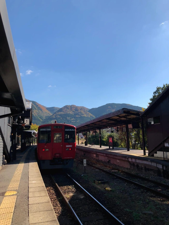 유휴노모리(초록색, 사진 속 기차는 다른 열차 입니다)기차는 동화 속 기차로 유명하다. 티켓이 금방 매진이 되기 때문에 이용할 생각이 있으신 분들은 일찍 예매를 해두는 게 좋다. 우리는 쿠로가와라는 더 산속의 온천마을로 가야 해서 기차 대신 버스를 타고 이동했다. 유후인 버스 터미널은 역 바로 맞은편에 있다.