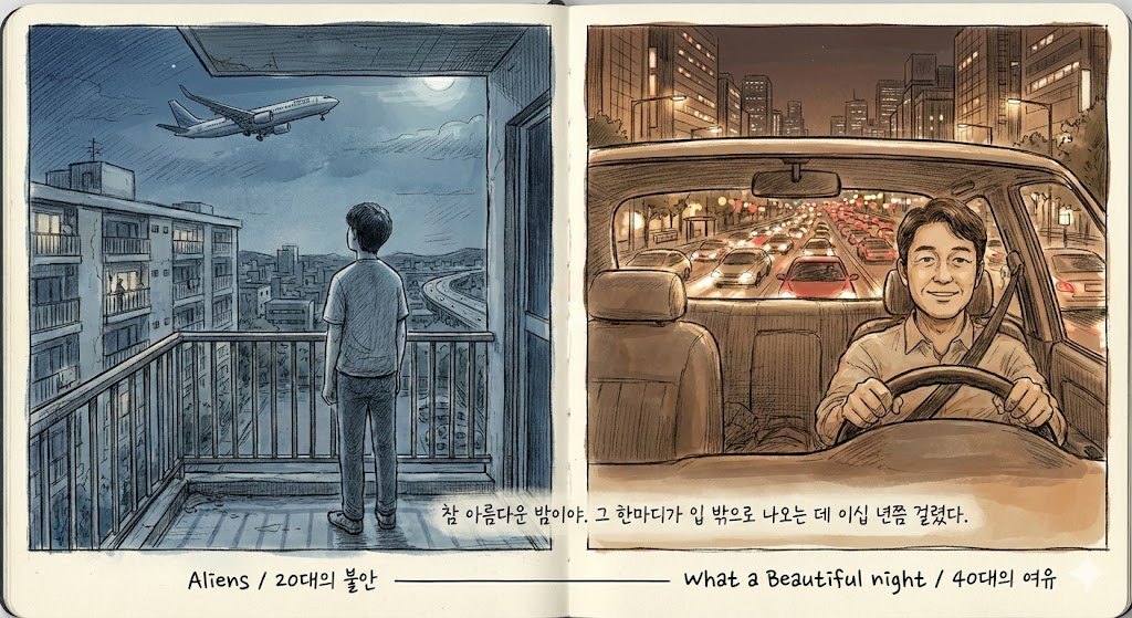 이 노래를 듣고 있는 순간만큼은 우주선을 기다리는 외계인이 된 것 같았다. 그러고 있으면 유유하게 흘러가는 밤도 시간도 나의 동지처럼 느껴졌다.