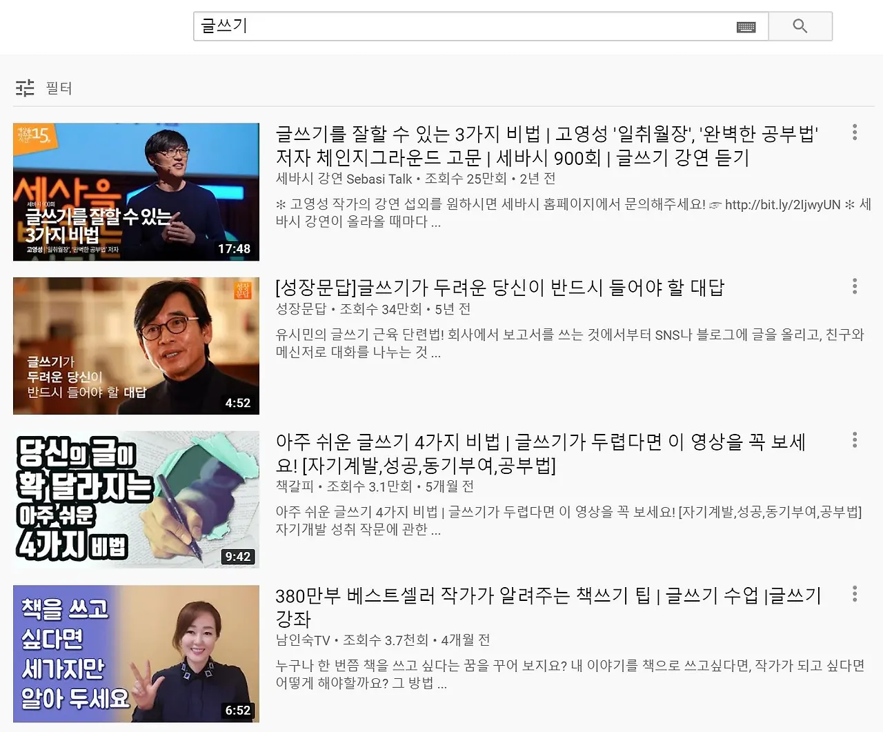 글쓰기라는 단어로 구글이나 유튜브를 검색해보면 수많은 동영상, 그리고 수많은 글쓰기 특강을 접할 수 있다.
