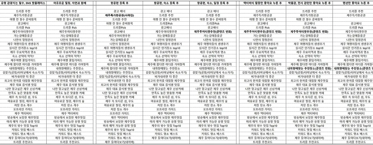 가장 먼저 여행 일정을 두 개 만들어 여행 스타일을 다르게 했다(유명 관광지/SNS 핫플 <-> 여유로운 힐링/자연과 함께). 그 결과 노출되는 콘텐츠는 대부분 유사했다.
