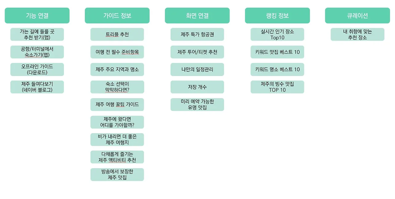 '제주' 도시 정보를 살펴봤다. 도시 정보 홈 탭은 크게 특정 기능을 연결하는 '기능 연결', '도시' 정보의 '가이드'에 있는 정보를 보여주는 '가이드 정보', 항공권 검색, 투어 티켓 검색 등 특정 화면으로 연결하는 '화면 연결', 랭킹 정보를 보여주는 '랭킹정보', 그리고 사용자에게 정보를 큐레이션하는 '큐레이션'으로 이루어져 있다(그림 위). 총 33가지의 작은 화면으로 구성된 홈 탭을 이러한 기준에 따라 나눠보면 아래와 같다(그림 아래)