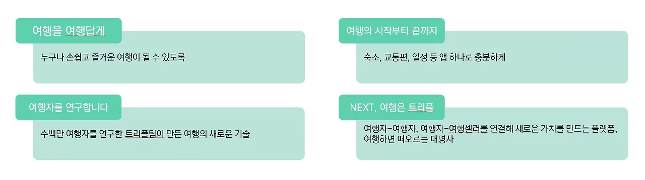 <트리플>은 '여행을 여행답게', '여행자를 연구합니다', '여행의 시작부터 끝까지', 'NEXT, 여행은 트리플' 총 4가지 가치를 추구하고 있다.