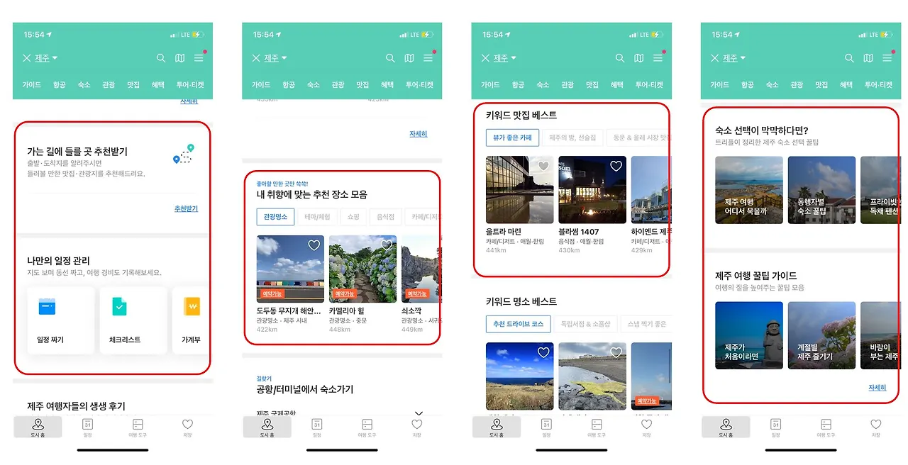 '제주' 도시만 하더라도 다양한 가이드가 있다. 그럼에도 불구하고 같은 가이드가 노출되고 있다. 사용자에게 필요한 가이드를 노출한다면 어떨까? 숙소를 고른 사용자에게는 관광지나 맛집을, 음식점을 고른 사용자에게는 카페를, 즉 사용자의 다음 Task를 위한 가이드를 제공하는 것이다.