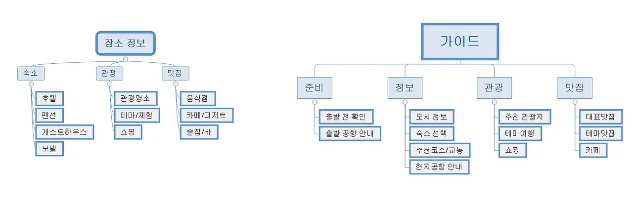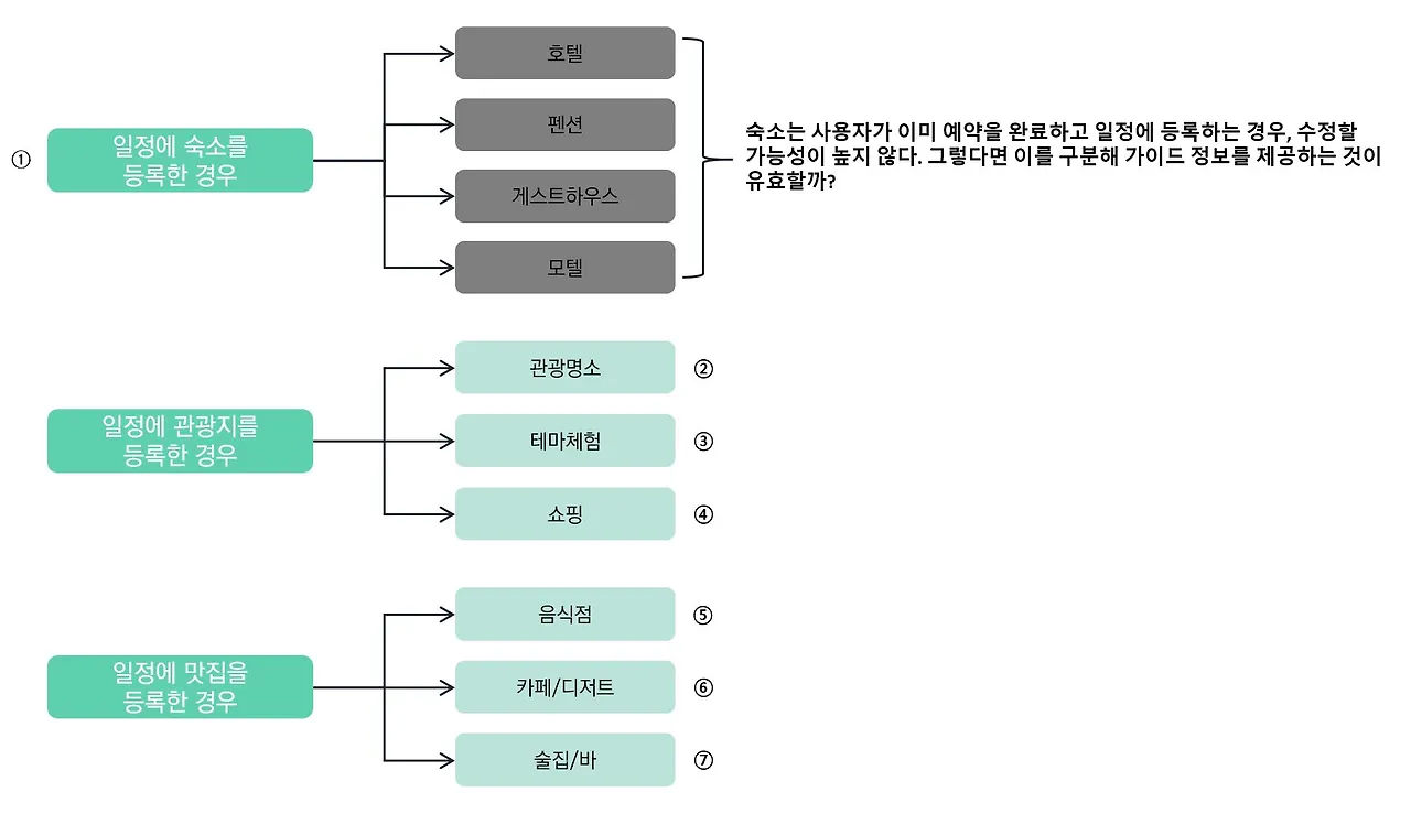 가장 먼저 사용자가 여행 일정에 등록한 장소에 따라 다른 가이드가 노출될 수 있도록 등록할 수 있는 장소 정보(구분점)를 정리했다. 그리고 사용자에게 제공되는 가이드 정보는 어떤 Depth로 이루어져 있는지 정리했다. 사용자가 여행 일정에 주로 등록하는 장소 정보는 크게 숙소, 맛집, 관광지가 있다. 가이드에 제공되는 정보는 여행 준비-정보-관광-맛집으로 구성되어 있다.