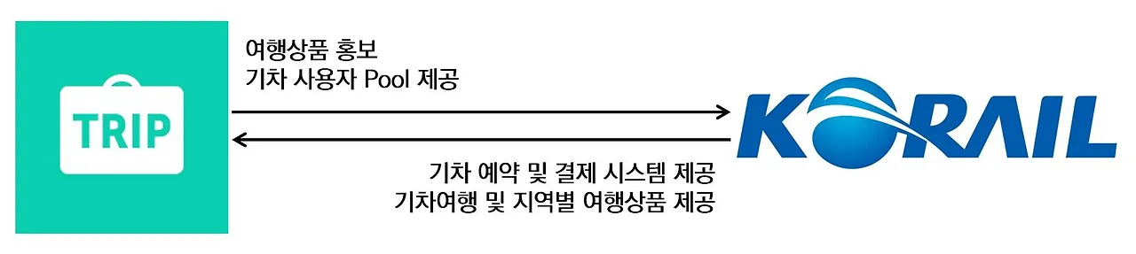 그렇다면 <트리플>과 <코레일>, 두 서비스가 어떤 시너지를 낼 수 있을까? <트리플>은 <코레일>이 제공하는 기차 예약 및 결제 시스템을 사용할 수 있으며, 동시에 기차여행과 지역별 여행 상품을 제공받을 수 있다. 마찬가지로 이렇게 제공된 기차 예약 시스템을 통해 <코레일>은 기차 사용자 Pool을 제공받을 수 있으며 <트리플>을 활용한 여행 상품 홍보가 가능하다. 이에 대해 간략하게 아래 그림과 같이 정리했다.