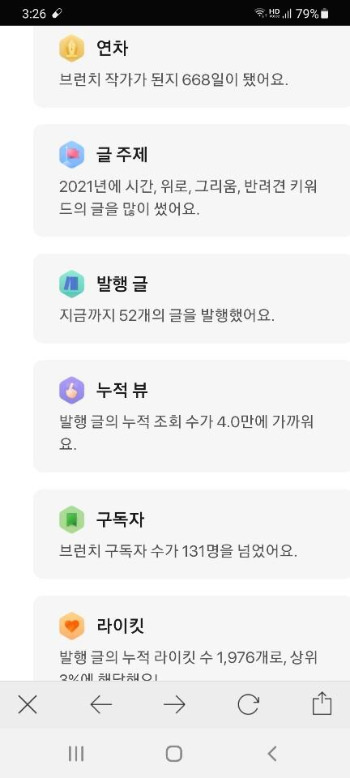 요즘 유난히 브런치 글 발행 알림이 많이 뜹니다. 자주 글을 발행하시던 작가님들은 물론, 요 근래 글로 만나 뵙기 힘들었던 작가님들까지 많은 분들이 글을 발행하고 계십니다. 왜 갑자기 이렇게 글 발행이 늘었을까요? 다름 아니라 브런치에서 <결산 리포트>를 제공하기 때문입니다. 조회수, 구독자수, 자주 발행한 글의 키워드 등 다양한 브런치 Data를 한데 모아 개인화된 리포트를 제공해줍니다. 이 리포트를 받는 것뿐만 아니라 '브런치 작가 카드'라는 작가 인증을 함께 제공하는데요.