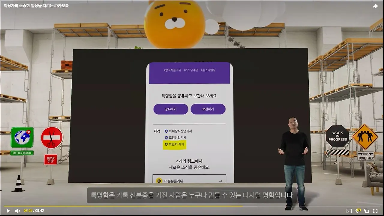 결산 리포트 신청을 통해 받을 수 있는 브런치 작가 카드는 나중에 톡명함에서 브런치 작가임을 증명하는 데 활용된다. 실제 브런치 작가임이 인증되어 추가된 모습을 <if Kakao 2021> Session 영상에서 일부 캡처해봤다.