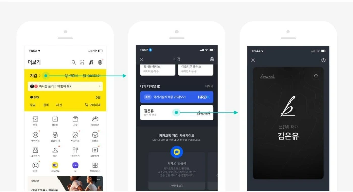 눈썰미가 좋은 사람이라면 위에 올려둔 톡명함 캡처본 하단에 희미하게 보이는 인증마크와 "정보처리기사"로 유추되는 문구를 찾았을 것이다. 브런치 작가 카드는 바로 이곳에 활용된다. <카카오톡 지갑>에는 디지털 ID라는 기능이 있는데, 여기서 카카오 인증서를 활용해 국가기술자격증을 등록할 수 있다. 또한 브런치 작가 카드와 같이 인증받은 정보를 담을 수 있다. 그리고 이러한 정보는 사용자 설정에 따라 <카카오 톡명함>에 담을 수도 있다.