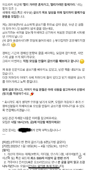 사람이 다 모이기는 하려나 하는 걱정도 잠시 2시간도 지나지 않아 모임 인원이 모두 차다 못해 조금 오버하기까지 했다. 그렇게 처음 스스로 만들어본 글쓰기 모임이 시작되었다. 그냥저냥 "카카오톡으로 글을 써서 공유해 주세요"하는 단순한 글쓰기 모임보다는 모임원들에게 조금이나마 도움이 되고 앞으로도 글을 이어나갈 수 있는 기회가 되었으면 하는 바람에 모임을 조금 다양한 방식으로 구성했다.