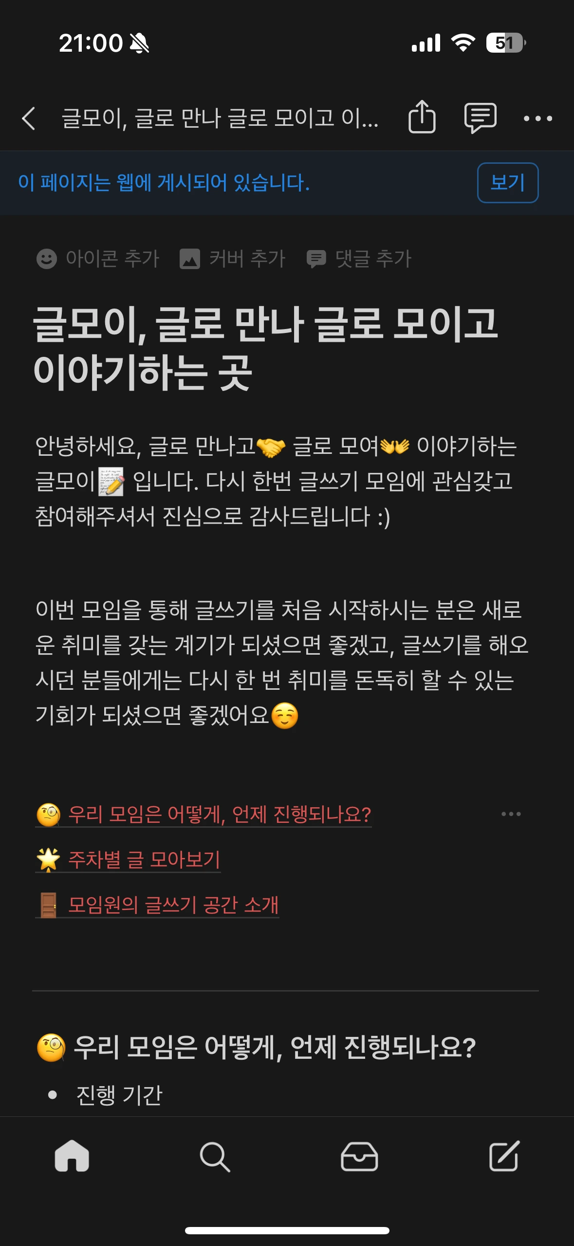 2025년, 그중에서도 글쓰기는 어쩌다 보니 혼자만의 것이 아닌 여러 사람과 함께 나누는 것이 되었습니다. '글로 만나 글로 모여 글로 이야기하는 사람들'이라는 뜻을 가진 글쓰기 모임 <글모이>는 2주에 한 번씩 글을 쓰고 오프라인으로 만나는 이야기를 나누는 사내 모임입니다. 어떻게 이 모임을 시작하게 되었는지, 그리고 모임의 절반을 지나가며 느낀 소회를 담아봤습니다.