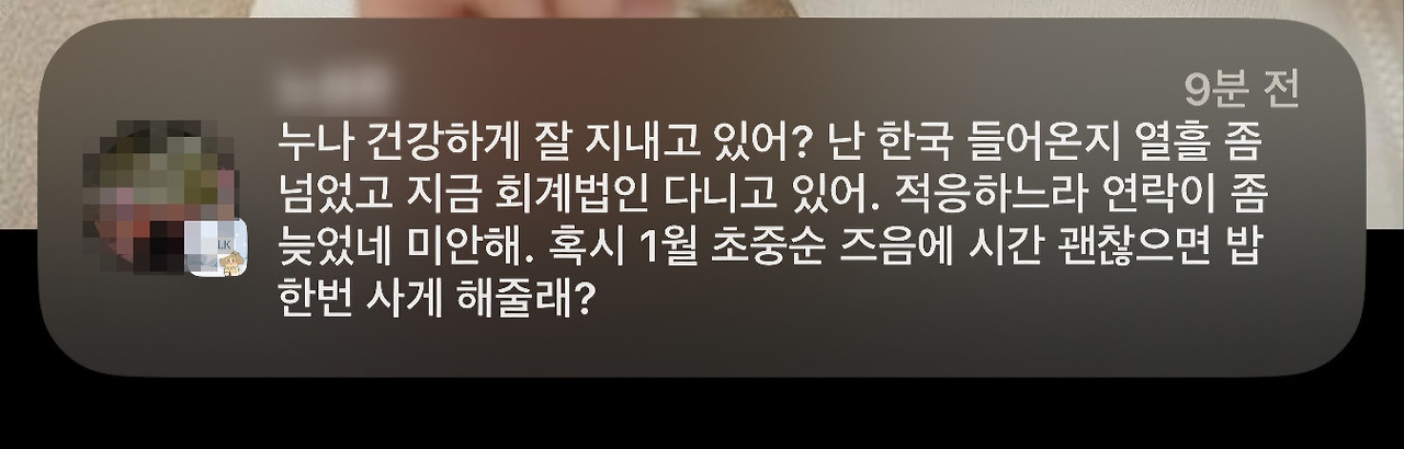 도련(F) 한국에 돌아오면, 우리 밥 한 번 먹자.
