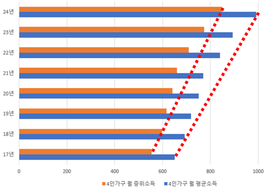 통계청의 가계금융복지조사에 따르면, 24년 기준으로 4인 가구의 월 중위소득은 848만 원이며, 평균소득은 992만 원이다. 이게 맞을까? 눈을 씻고 다시 봐도 이 금액이 맞다. 평균 소득은 4인 가구 전체에 대한 분모의 값을 나눔으로써 구한 값이며, 중위소득은 낮은 가구의 소득부터 시작해서 순서대로 나열했을 때, 중간 위치의 소득을 의미한다. 평균소득이든 중위소득이든 월 8~9백만 원을 받는 사람들이 이렇게나 많다는 것인가?