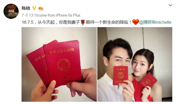 혼인신고를 마친 진효는 자신의 SNS 웨이보에