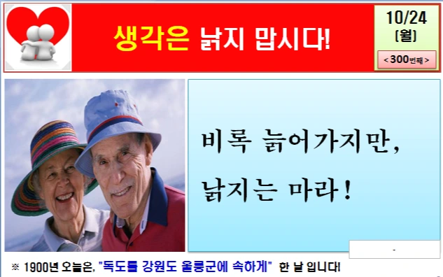 우리 함께 늙어감을 고맙고 감사하게 생각합시다. 세월이 지나간 자리에 흔적을 남기는 일은 지극히 당연한 일입니다. 그것이 일이 되어 업적으로 남겨질 수도 있고 삶의 무게로 얼굴에 주름으로 남겨질 수도 있습니다. 지나온 발자취를 남길 수 있다면 늙더라도 아름다운 늙음을 가지는 길이라고 생각됩니다. 하지만 분명히 기억해야 할 것은, 육체의 늙음이 생각까지 늙게 만들어서는 안 된다는 사실입니다. 깊은 주름살에도 생동감 넘치는 생기가 스며들어 있어야 하고 환한 미소엔 세상을 담을 수 있어야 합니다. 아름답게 물들어가는 삶이야말로 우리가 시간이라는 그를 수 없는 세상에 대한 외침이고 투쟁입니다.