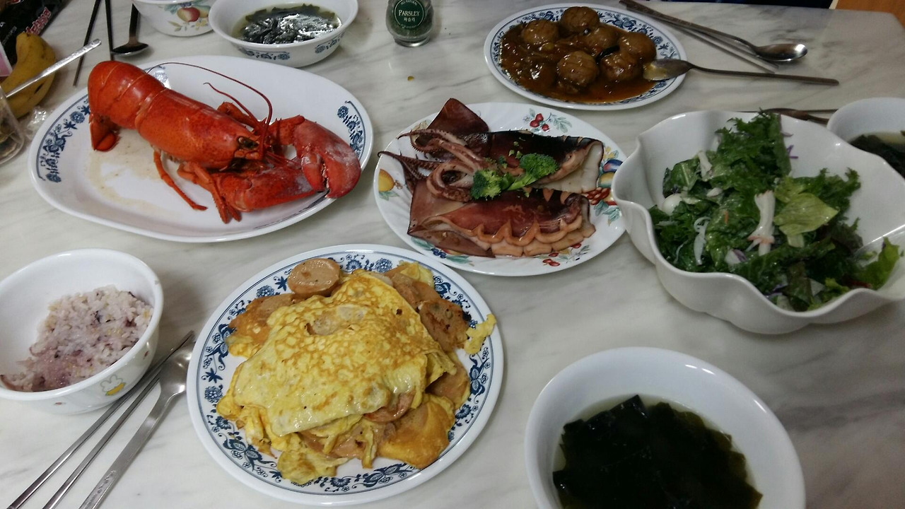 통오징어 구이를 하려다가 우연히 보인 작은 랍스터에 눈길이 가서 한 마리 구매했습니다. 랍스터가 있고 없고는 분위기도 좀 틀린 듯합니다. 미역국에 야채샐러드까지 그래도 구색은 조금 갖쳐진 생일상인 듯합니다. 아침부터 아내는 방 안에 가둬놓고 달그락달그락 거리며 요란을 떨다가 만든 46번째 아내의 생일상입니다.