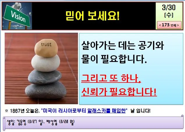 아무리 속이고 속는 세상이라지만, 믿지 못한다면 한 걸음도 더 밝은 세상을 향해 갈 수 없습니다. 항상 그 자리에 머물며 속물근성만 가득 채워 나이만 먹어 갈 뿐입니다. 추구해야 할 삶의 가치는, 지금보다 더 나은 세상을 만들어 가는 것입니다. 나만 즐겁고 편한 삶이 아니라 우리 모두가 함께 즐기며 콧노래 부를 그런 세상이어야 합니다. 그 세상을 향한 첫걸음이 "믿음이고 신뢰입니다!"