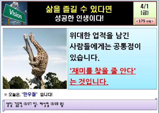 그래서 웃을 줄 알고, 즐길 줄 아는 사람이 되어야 한다. 위대한 업적을 남긴 사람들은 재미를 찾을 줄 아는 사람들이라 한다. 재미와 즐거움이 선한 영향력으로 전해질 수 있다면 지금보다 더 나은 세상이 되리라 확신해 본다.