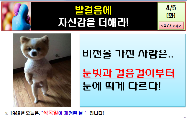 아침 출근길, 무엇인가를 빼놓고 나오는 허전함이 묻어 있지 않나요? 그 허전함은 피해의식과 소외감 그리고 열등감들이 뭉쳐진 나약함에서 비롯될지 모릅니다. 나의 약함을 버리고 강함을 찾으세요. 그 강함은 뚜렷한 비전과 목표에서 시작됩니다. 하지만, 비전을 모르시겠다고요?