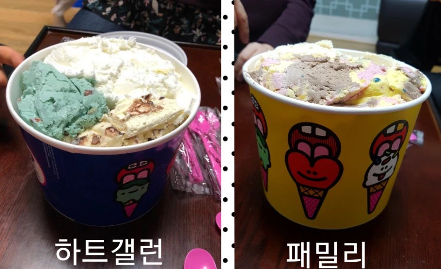 두 개의 아이스크림을 비교해보니, 설날 써리원 이벤트(?)에 당첨된 느낌이다. 19,500원으로 패밀리와 하트갤런 사이즈를 다 맛보았다. 또한 맛도 모두 달라서 8가지 맛을 봤다. 다만 뒤에 먹은 패밀리보다는 먼저 먹은 하트갤런이 더 맛있었든 것은 확실하다. 공짜보다는 제대로 돈 주고 먹는 것이 더 맛있나 보다.