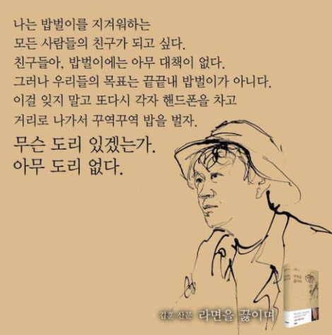 라면은 가장 저렴하면서 서민적인 음식이다. 배고픔과 삶의 비애를 비유할 때 적절한 단어라고 생각된다.'끓이다'라는 동사를 통해 먹고살아야 하는 서민의 삶을 대변하고 있다. 부글부글 끓는 이미지가 삶은 결코 녹록하지 않다는 의미도 내포되어 있으리라...