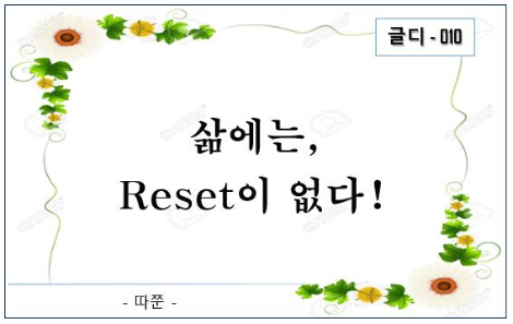 이럴 때 하는 일이 대부분 'Reset'이다. 가장 손쉬운 방법이고 가장 익숙한 방법이다. 또한 대부분은 Reset 한 번에 해결된다. 지나간 기억은 지우고 아무 일 없었다는 듯 새로운 화면을 제공한다. 또한 일에 쌓인 무게를 덜어내고 스스로 가벼워졌기에 가벼워진 몸으로 열심히 돌아다닌다. 컴퓨터 본체보다 마우스가 더 신난 듯이. 가끔은 너무 잘 미끄러져 되돌리기에 벅차기도 하다. 그런데 체력이 떨어지고 일의 무게에 쌓이면 또 버벅거리며 먹통이 된다. 그러면 다시 Reset을 무한 반복하게 된다.