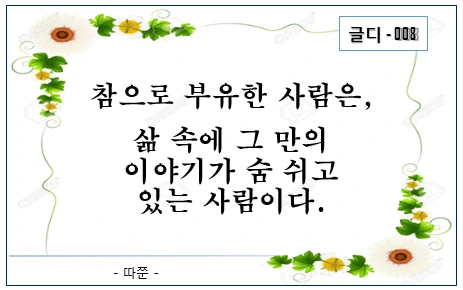 "참으로 부유한 사람은 삶 속에 시가 있는 사람, 삶 속에 침묵이 있는 사람, 삶 속에 뿌리가 있고, 삶 속에 축제가 있으며 내면의 정원에 꽃이 만발한 사람이다." <라즈니쉬>