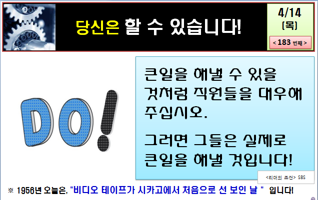 일도 마찬가지입니다. 동료나 후배에게 자신감을 불어넣어 주는 일은 그 무엇보다도 중요합니다. 해낼 수 있다는 믿음이 스스로에게 주어지지 않으면 진취적인 생각과 기상은 아득해지고, 소심해지고 눈치보며 일하는 모습이 될 수 밖에 없습니다. 현실에 안주하고 도전하기 보다는 욕먹지 않는 '복지부동'의 모습이 되고 마는 것입니다.
