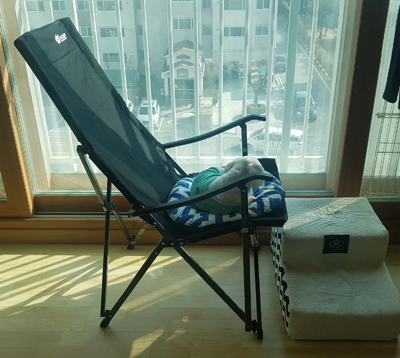 반려견(여름이)이 발톱으로 끍기도 했지만 너무 낡아서 버렸다. 그러고 나서 한동안 아무 불편 없이 지내다, 베란다 창가에서 바라보는 풍경에 마음이 이끌렸다. 그래서 캠핑 갈 때도 사용하고 집에서도 사용할 목적으로 쿠팡을 통해 릴랙스 체어를 구매했다.