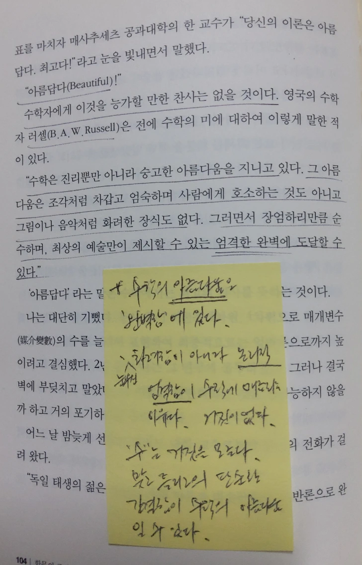 책은 중고 온라인으로 구매했다. 그래서 새것보다 더 정감이 간다. 손때 묻은 옅은 노란색 표지가 새것에서 느끼지 못하는 편안함을 준다. '너무 부담 갖지 마! 이전 사람도 다 읽은 책이야. 벽돌 책 같은 두꺼운 책이 아니라 읽기에 알맞게 얇아. 수학자의 배움의 과정 특히, '특이점 해소'라는 문제를 풀어나가는 과정을 담백하게 얘기하고 있어.'