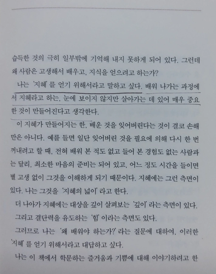 저자는 지혜를 통해 문제를 해결하고 새로운 것을 창조하는데 목적을 두고 있지만, 내가 생각하는 배움의 목적은 배워서 남 주기 위함이다. 지혜의 넓이와 깊이 그리고 그것으로 얻게 되는 사회적 힘과 능력도 결국은 얻는 것을 토해내는 과정이어야 한다. 서양 문화의 근간을 이루는 라틴어에 "도 우트 데스(Do ut Des)"라는 말이 있다. 직역하면 '네가 주기 때문에 내가 준다' 영어로 '기브 앤 테이크'의 의미이다. 상호주의라는 개념으로도 설명되는데, 상호 간에 서로 주고받을 수 있다는 믿음 없이는 이 사회가 존립하기 어렵다는 의미이다.