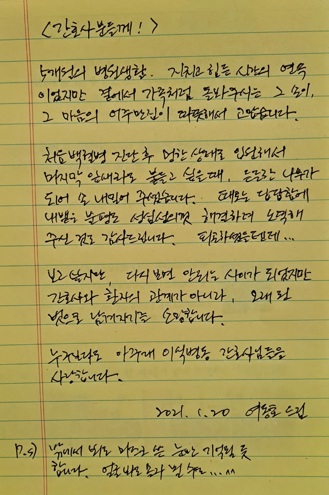 28.마지막 항암을 끝마치고 드뎌, 퇴원했다. 이곳도 정들었다고 막상 떠나려니 눈길이 계속 간다. 5개월의 병원생활, 결코 짧지도 쉽지도 않은 시간이었다. 내 이름이(풀네임) 이렇게 많이 불려보긴 처음이다. 수액을 맞고 수혈을 받고 약을 복용할 때, 그리고 침상 정리할 때도 어김없이 이름을 부른다. 처음엔 어색했지만 이제는 누군가 내 이름을 이렇게 살갑게 불려줘서 감사하게 된다. 김춘수 시인의 <꽃>에서 처럼 이름을 불러줘 누군가의 꽃으로 거듭난 느낌이다. 꽃이 된 기념으로 아쉬운(?) 마음을 편지로 담았다. 담당 교수님과 간호사분들에게 정성을 담아 썼지만 글씨체는 마음에 안 든다. 그래도 편지라도 전해서 빚진 마음의 짐은 가벼워졌다. 퇴원하며 복도에서 간호사분들과 찍은 사진 한 컷(허락 구하지 않아 사진은 못 올리겠다), 추억과 기억의 언저리를 넘나들며 이식병동 생활도 마무리했다.