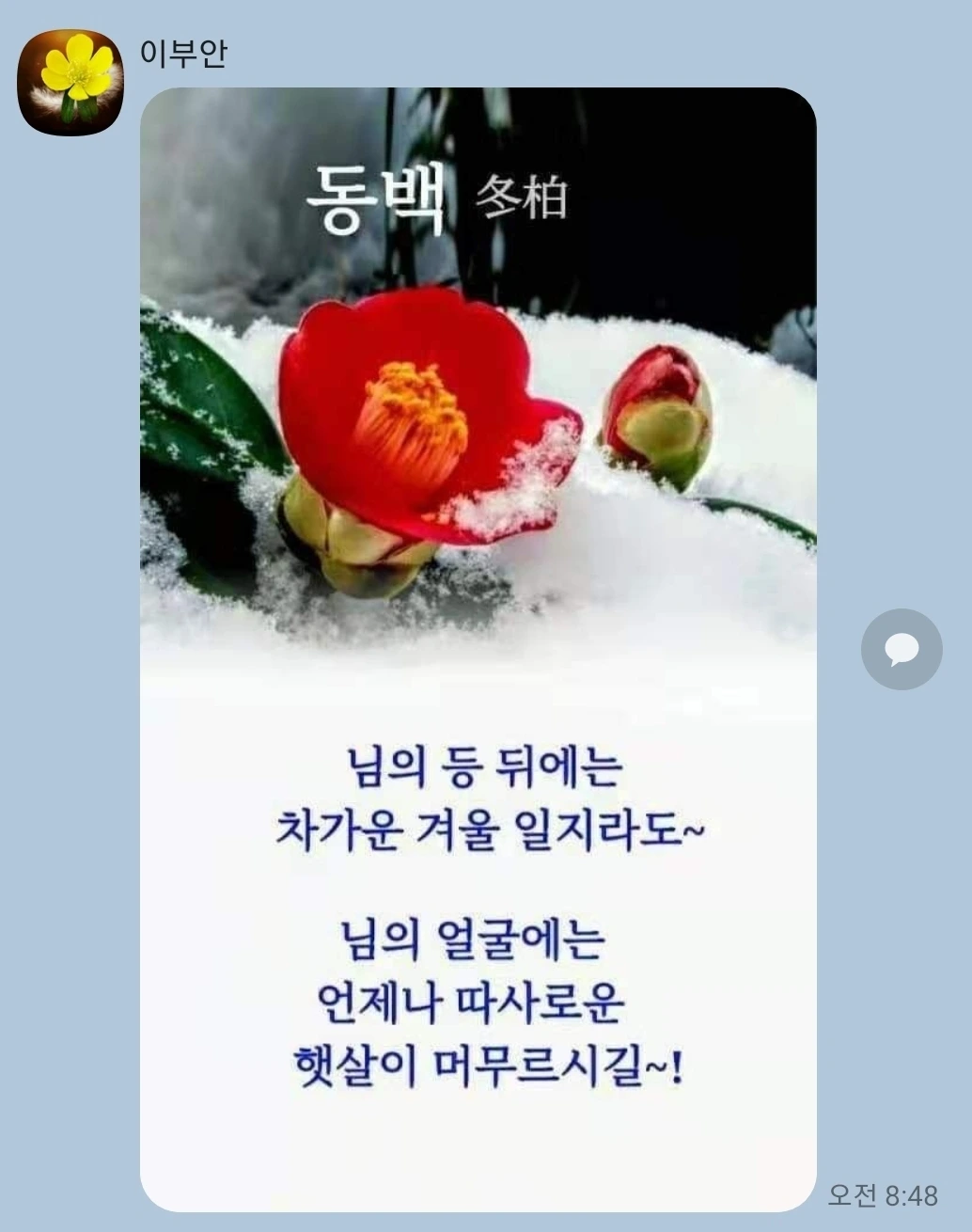 동백꽃을 유심히 바라보면, 언제나 미소 띠며 화사하게 반기는 모습이 어머니를 닮았습니다. 자신의 등 뒤의 짐은 아랑곳하지 않고 아들에게 좋은 면만 보이려는 어머니. 지금도 아프시지만 언제나 밝은 목소리로 통화하려고 목소리에 힘주시는 어머니. 아프면 모습을 보여주지 않으시려 피하시는 모습에 마음이 아픕니다. 동백은 어머니의 미소를 머금고 있습니다. 혹한 속에서도 병환 속에서도 항상 미소로 아들을 대하는 동백꽃 닮은 어머니...