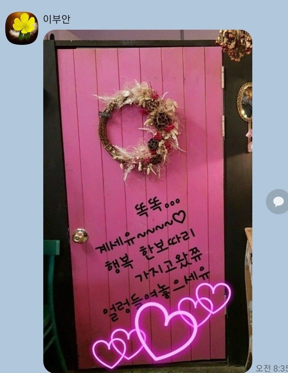 그런 제게 이 그림은 "똑똑..." 제 마음의 문을 두드리며 다가오네요. 행복 한 보따리 갖고 왔으니 이제는 닫힌 빗장을 풀고 그 마음의 문을 열어라고 말하네요.^^