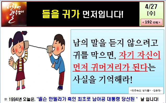 "남의 말을 듣지 않고 귀를 막으면, 내가 먼저 귀머거리가 됩니다." 경청하지 않으면 필히 들어야만 할 얘기도 듣지 못하게 될지 모릅니다. 내가 많은 것을 전달하려고 한다면 먼저 들으세요. 들어야만 들린다는 단순한 진리를 행동으로 옮겨야만 "들을 귀" 있는 사람이 됩니다.