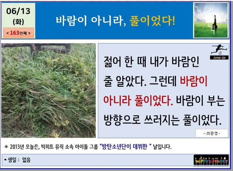 │바람에 맞서거나 바람의 반대방향으로 꼿꼿이 서는 풀이되고 싶은 때도 있었습니다. 그러나 늘 바람방향으로 쓰러졌습니다. 자꾸 쓰러지다 보니 이젠 쓰러지는 일이 두렵지 않습니다. 다만, 쓰러지되 꺾이지 않습니다. 그럼 됐습니다. -최준영-