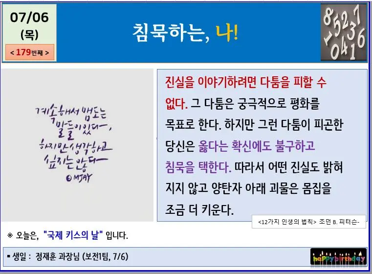 "침묵은 금이다"라는 격언이 있지만, 결코 침묵해서는 안 되는 때가 있다. 누군가 위기에 빠져 있을 때나, 불의에 항거해야 할 때 그리고 내가 비틀거리며 중심을 잡지 못할 때이다. 특히 스스로에게 침묵해서는 안된다. 말해야 할 때, 나서야 할 때, 나서지 못하고 침묵한다면 양탄자 아래의 괴물이 몸집을 키워 집을 통째로 이고 달아나는 사태를 지켜보고만 있어야 할 것이다.