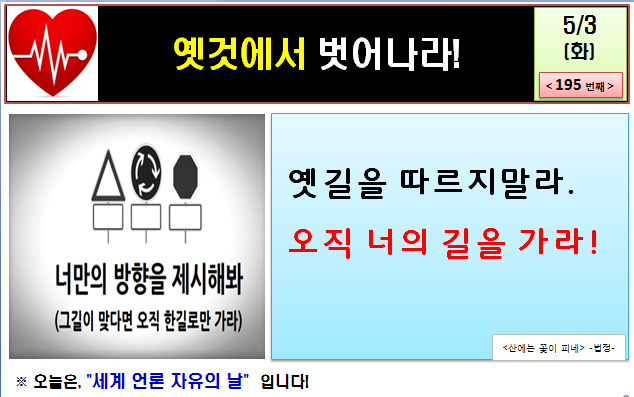 그렇지만 옳은 길과 옳지 않은 길은 너무나 스스로 잘 알고 있습니다. 옛길만을 쫒아가다 보면 나의 길, 내 삶은 없이 다른 이들의 삶에 편승해서 가게 됩니다. 내 삶에 내가 없고 다른 사람이 들어서 있는 꼴이 되고 맙니다. 요즘은 이야기가 강조되는 시대입니다. 스토리텔링을 넘어 스토리 두잉(Story Doing)으로 넘어가고 있습니다. 단순히 이야기를 전달하는 역할에만 머무르지 말고, 직접 행동으로 이야기를 보여줘야 한다는 것입니다. 그 이야기는 옛 생각 옛 습관 옛 풍토를 따르지 않고 오직 나만의 이야기를 만들어야만 가능한 것입니다.