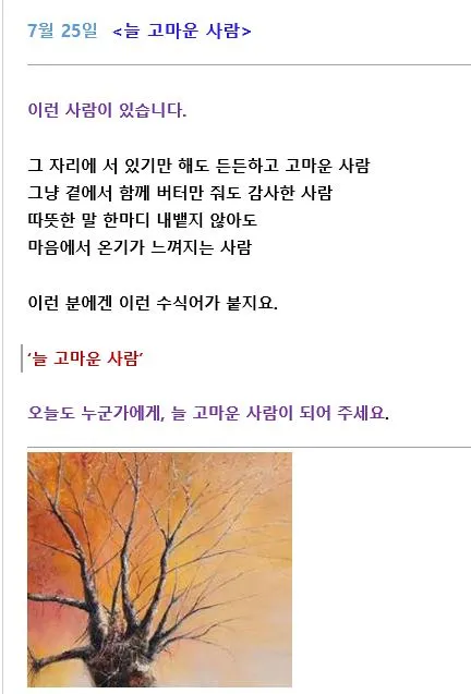 우리가 바라보는 세상은 요만큼이 아닐는지요. 요만큼 보면서 뭐 대단한 세상을 바라보는 것 마냥 근덜 거리며 사는 것일 수 있습니다. '늘 고마운 사람'은 고목 같은 사람입니다. 천 년을 살아도 언제나 그 자리에서 누군가를 지켜주는 버팀목이 되는 사람. 곁에서 숨소리만 들어도 마음이 편해지는 사람. 말을 나누지 않아도 마음이 따뜻해지는 사람......