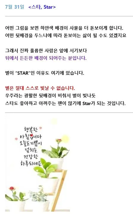 별은 스스로 빛날 수 없기에, 별이 되고 싶어 어디엔가 줄을 대며 빛나게 해 달라고 조르는 모습을 다양한 매체를 통해 듣고 보게 됩니다. 대표적인 사례가 정치인들이지요. 국민의 대표성을 띠고 민의를 대변해야 할 사람들이 목소리로만 국민을 앞에 세우고 어떻게든 본인이 빛나려고 노력하는 부류들입니다. 한편으로 가엾고 또 다른 한편으론 가엽게 보는 제가 더 오지랖이라는 생각을 하게 됩니다.