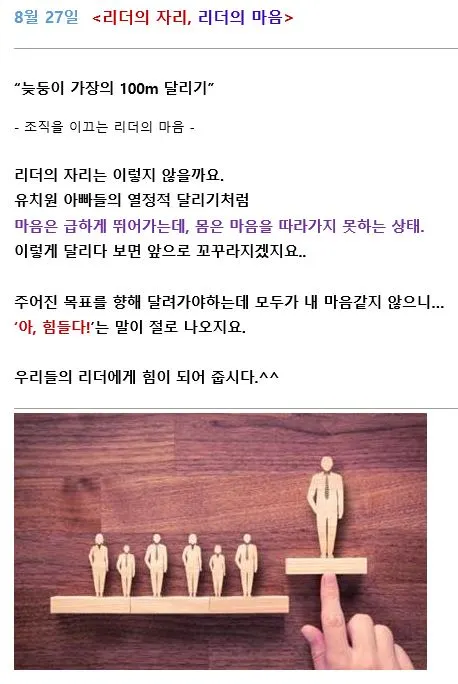 우리 아이 유치원 체육대회 때 달리기하며 넘어졌던 아픈 기억이 떠오릅니다. 아픈 것도 아픈 것이지만 쪽팔렸던 기억이 더 아팠던 것으로 추억됩니다. 지나고 나면 다 아름다운 이야기들이지요. 이렇게 넘어지는 걸 알면서도 협곡과 험로를 지나가야 하는 게 리더에게 주어진 숙명이겠지요.