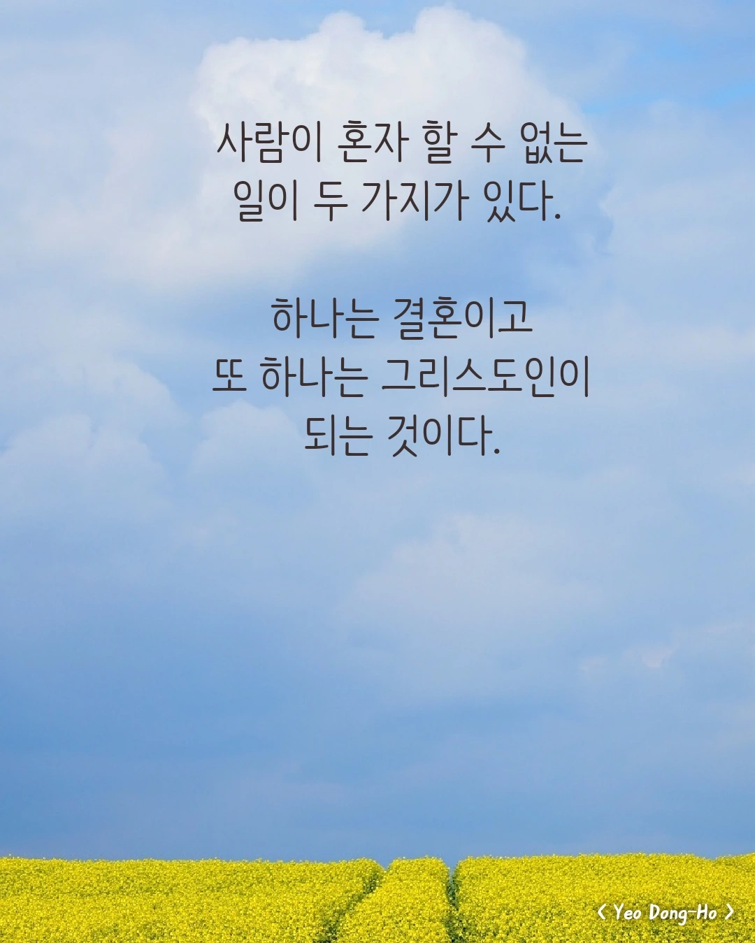 하고 싶어도 할 수 없는 일이 있어 때로는 서글프다. 나태주 시인은 인생은 아름답다고 표현했다. 그 이유가 그리움 때문이라고 말한다. 결혼도 그리스도인이 되는 것도 그리워해 줄 누군가와 동행할 존재가 있기에 가능한 일이 아닐까.