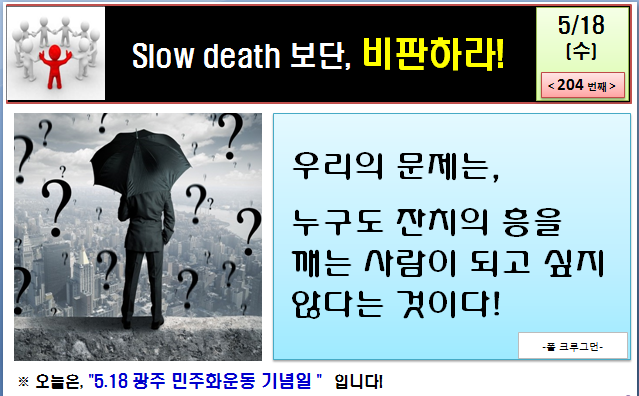 국가든 회사든 가정이든 잘 못 되어가는 것을 알면서도 얘기하려 하지 않습니다. 모두들 편하게 잘 살아가고 있는데, 지금처럼 이러면 안 된다고 지적하면 '흥을 깨는 사람'이 되고 맙니다. '그래 너는 그렇게 잘 났어?'라는 비판을 들을 각오를 하는 이들이 많이 필요한 때입니다. 좋은 게 좋은 거라는 인식이 우리 사회에 뿌리 박혀 있는 현실에서 쉽지 않은 용기가 필요하겠지만, 아닌 것을 아닌 것이라고 말하고 잘못된 것을 잘못된 것이라고 말할 수 있는 용기가 우리 사회를 더 아름답게 만드는 디딤돌이 될 것입니다.