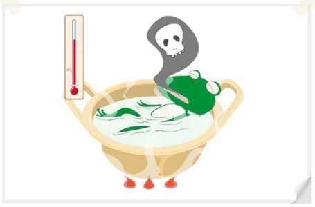 개구리가 참 편안해 보이죠! 따스한 냄비 속에서 편안한 일상을 즐기고 있습니다. 그 편함의 유혹이 죽음의 공포를 잊게 만들고 있습니다.