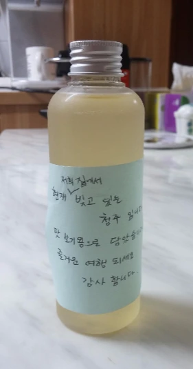 씻고 짐 정리하고 나오니 현관에 '청주'가 놓여 있었다. 손수 직접 빚은 것이라며 맛보기로 담았단다. 세심한 배려에 감사하게 된다. 아마도 새벽잠 없이 부지런이 일하려 나가시기에 이렇게 메모로 온정을 남겨두신 듯하다.