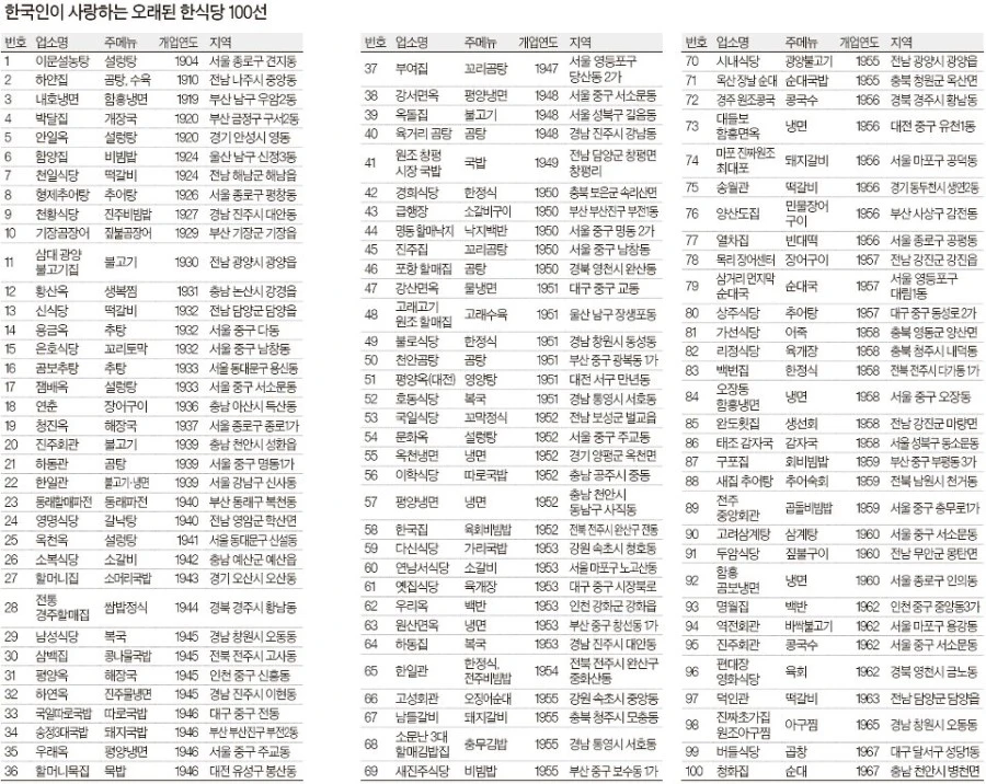 노포 음식점을 나열해 놓은 '한국인이 사랑하는 오래된 한식당 100선' 이라는 책이 있는데요. 이 책에는 한국에서 가장 오래된 음식점 100개를 종류별로 나열해 놓기도 했습니다. 이 표를 자세히 살펴보면 100개의 음식점 중에서 국, 탕류가 40곳이나 됩니다. 그만큼 접근성이 용이한 음식 카테고리 중 하나가 국물이 있는 음식 아닐까라는 생각이 드는데요.