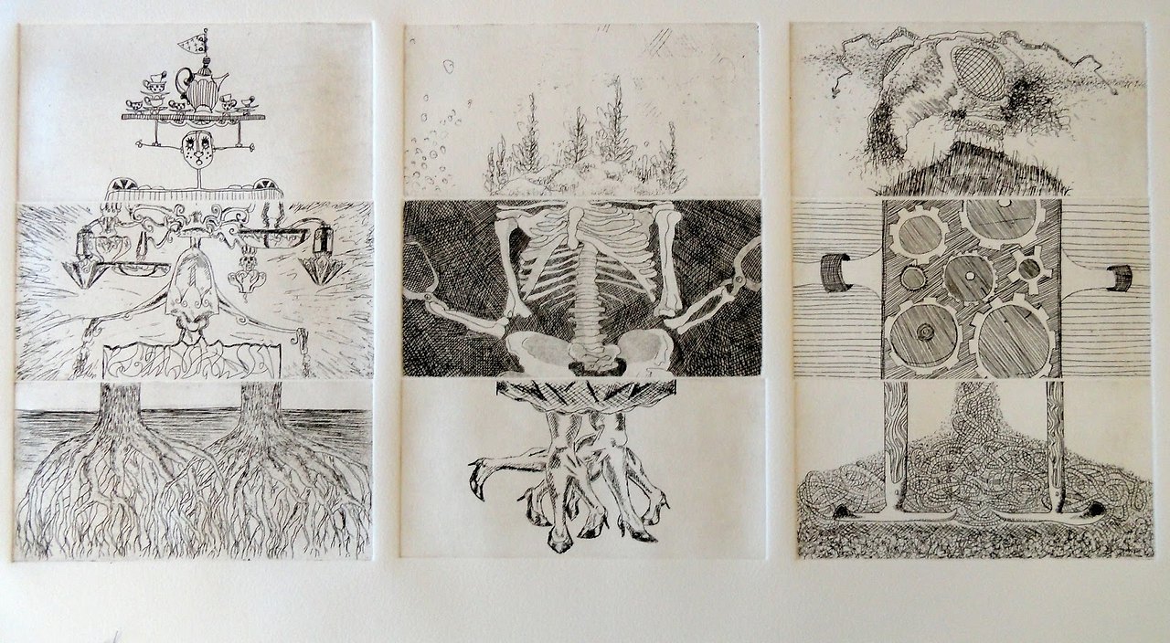 이때 방식을 Exquisite corpse라는 게임에서 영감을 얻었는데요. 프랑스어로는 카다브르 엑스퀴Cadavre Exquis라고 불리는 이 게임은 각가 다른 예술가들이 서로의 작업을 서로 전혀 모른 채 이미지를 순차적으로 그려 하나의 그림을 완성하는 방식입니다. 그러기 때문에 각 부분이 어울리진 않지만, 장난기 있는 구조로 독특한 작품이 탄생되기도 하죠.